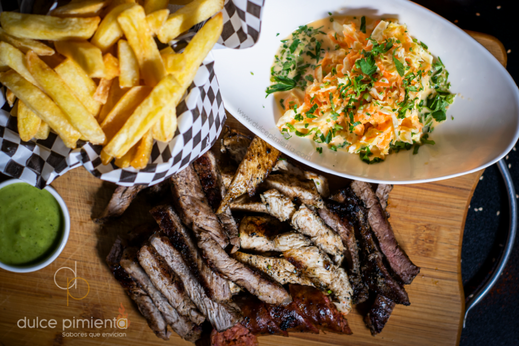 Carne, pollo, cerdo, chorizo, acompañado con papas fritas, ensalada y aderezo de la casa.