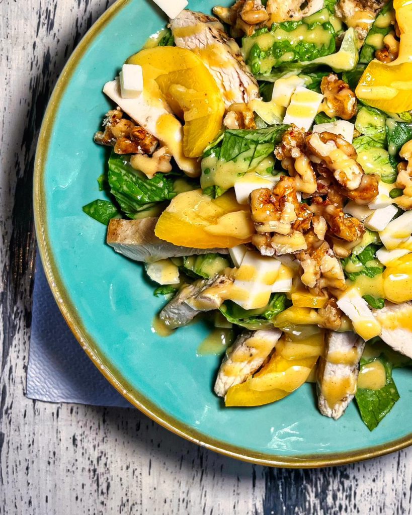 Ensalada de lechuga, queso cabra, durazno, nueces garrapiñadas en merken con aderezo de mostaza y miel.