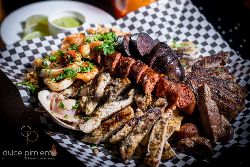 Carne, pollo, cerdo, chorizo, prieta, calamares, camarones, almejas, en una cama de papas fritas, cebollas caramelizadas, bollo aliñado y tostones de plátanos Macho.