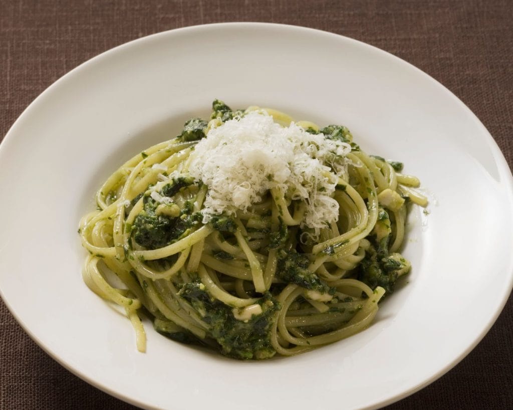 pasta con salsa aromática de albahaca fresca, nueces, ajo, queso parmesano, aceite de oliva y coronado queso parmesano rallado.